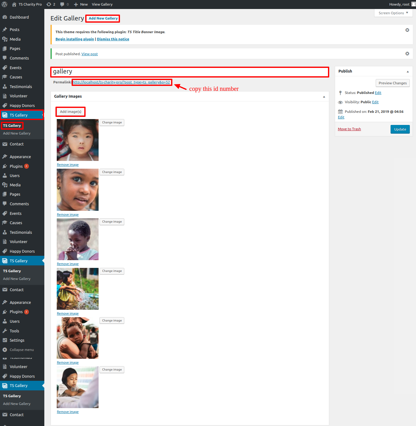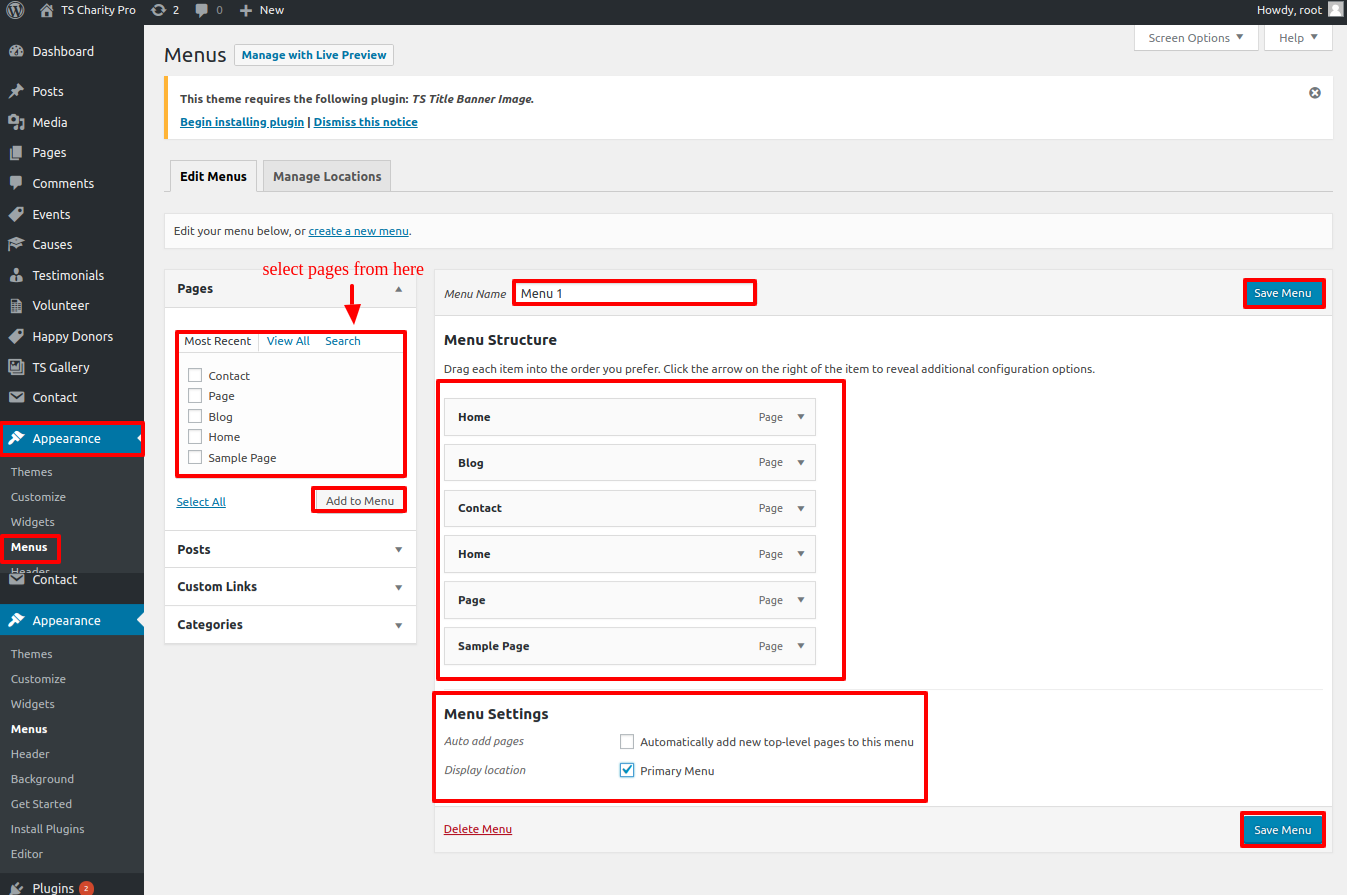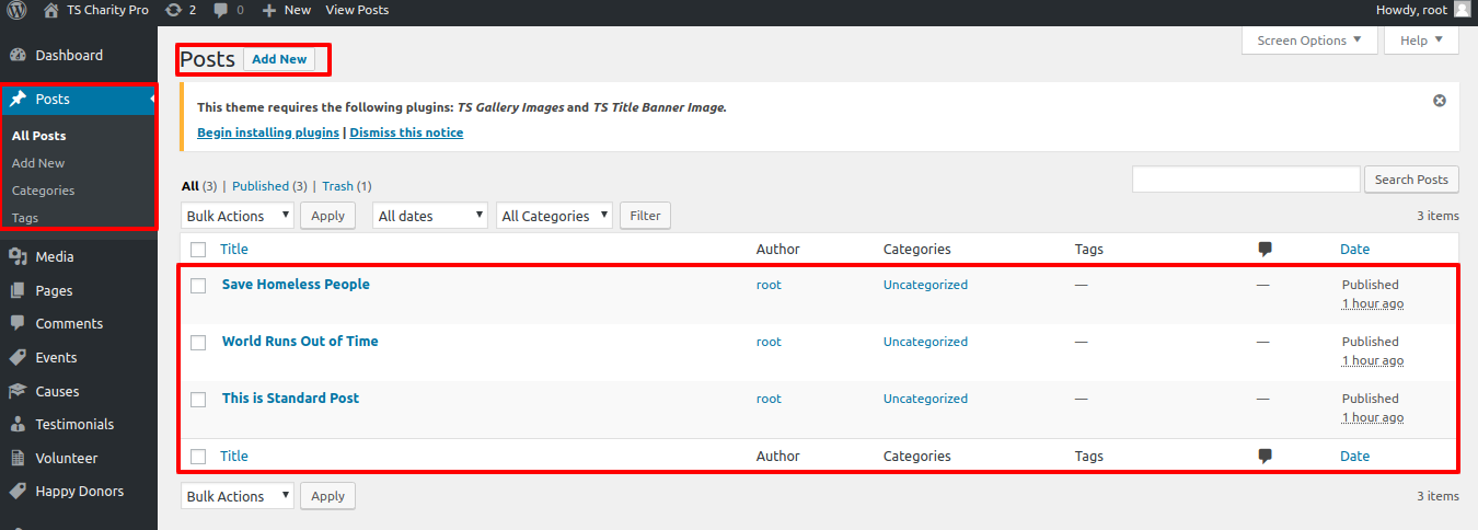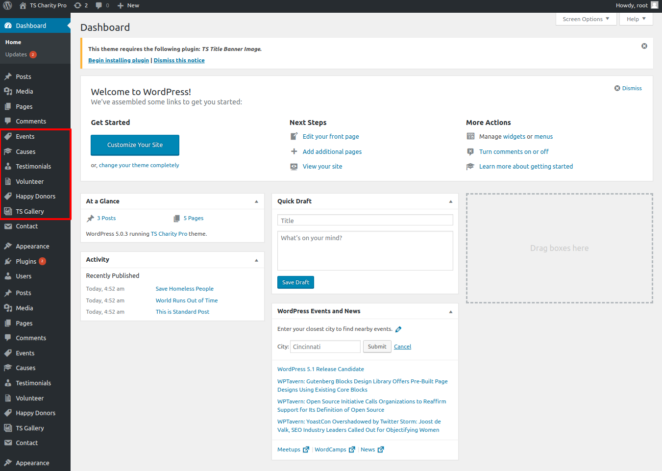 The TS Charity Pro Post Types, TS Gallery Image, TS Title Banner Image, and Contact Form 7 plugins must be added to and activated in the Plugin area.