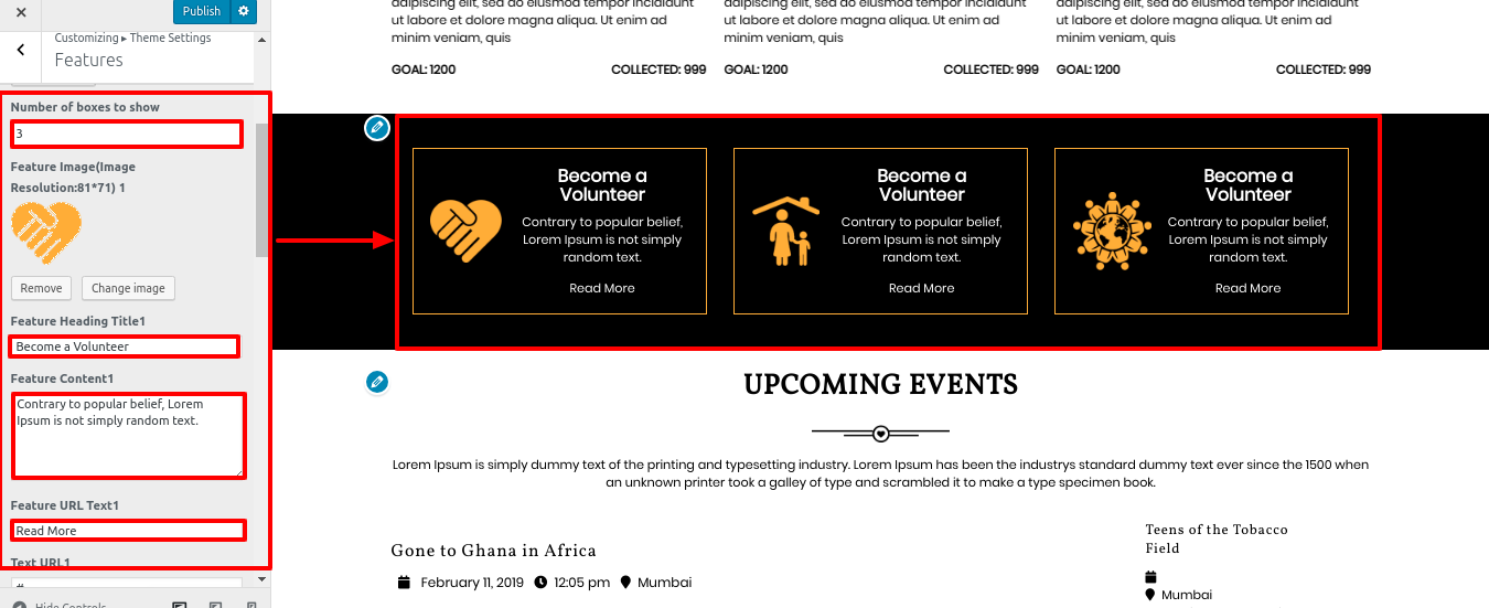 Go to Appearance >> Customize >> Theme Settings>> Feature Section