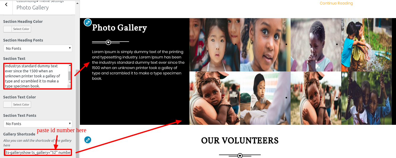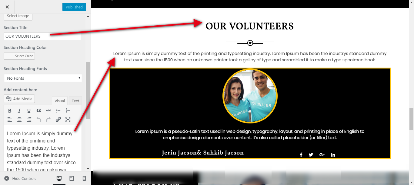 Go to Appearance >> Customize >> Theme Settings >> Our Volunteers.