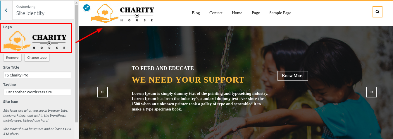 Dashboard -> Appearance -> Customize -> Site identity.